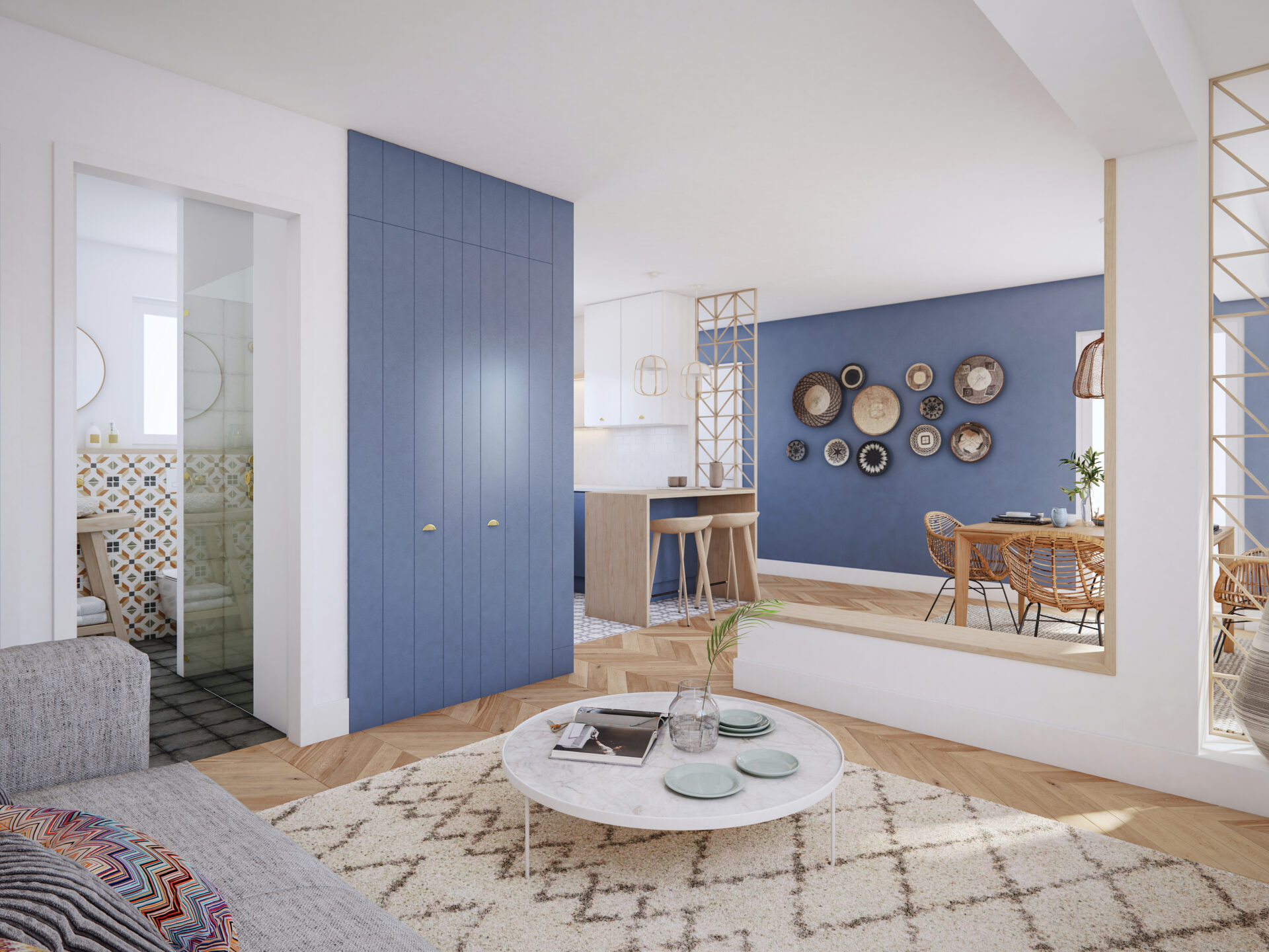 Diseñé una nueva distribución de espacios, dos cuartos de baños y una cocina abierta al salón. Elegí todo el material de obra, acabados y carpinterías y realicé la lista de la compra incluyendo todo el mobiliario, iluminación, textiles y decoración.